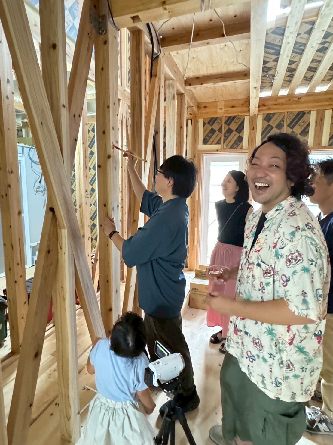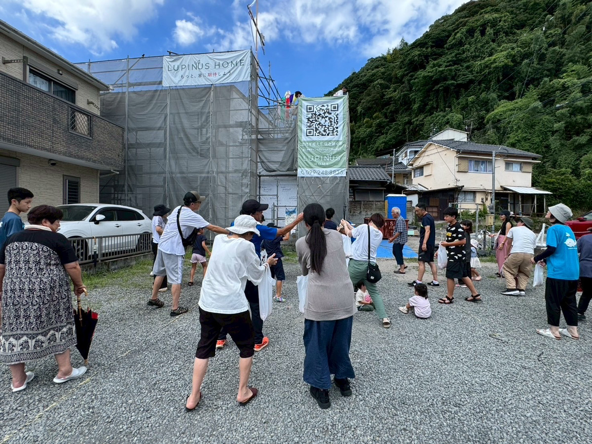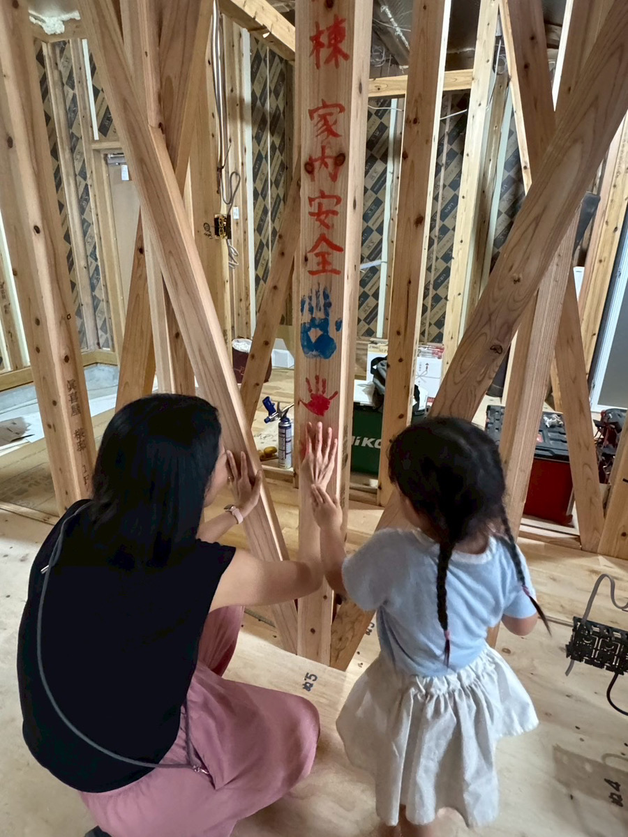 餅やお菓子をまくこの風習には 「厄を払う」「福を分け合う」「家の繁栄を願う」という意味が込められています。 お配りしたお餅は、焼かずに食べてもらう様きちんとお伝えしました。 上棟という節目を地域の皆さんと一緒にお祝いできることは、とても貴重で、心温まる時間でした。 その後「手形式」も行い、家族みんなの手形を構造材にしっかりと貼り付けました。